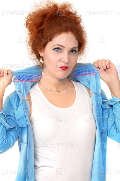 Портрет красивой веселой рыжеволосой девушки в джинсовой рубашке и белом футболке