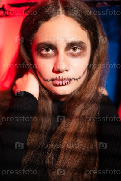 Девушка-подросток на вечеринке Хэллоуина с раскрашенным черепом на лице смотрит в камеру со страхом