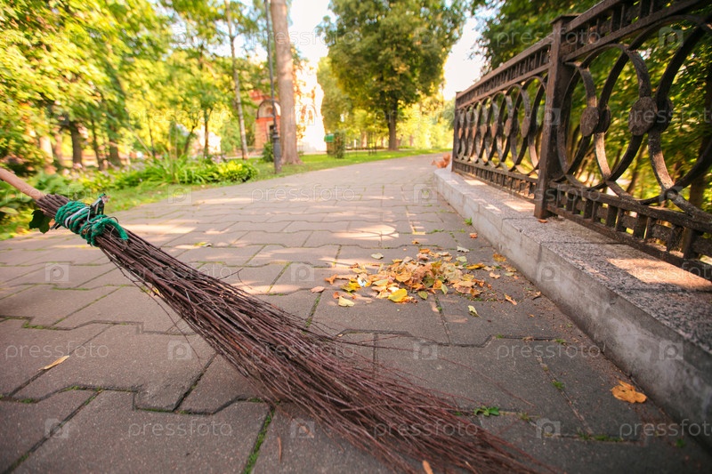 Метла с ветвей подметают желтые выпавшие листья на асфальте
