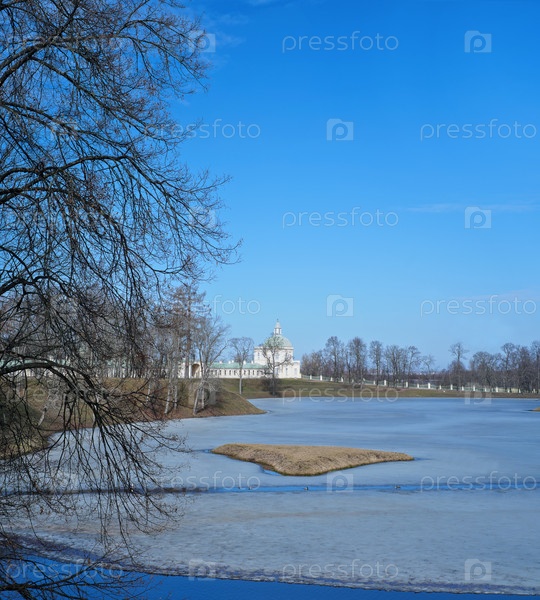 Ландшафт на берегу Нижнего пруда в солнечный весенний день (Ораниенбаум, Санкт-Петербург, Россия)