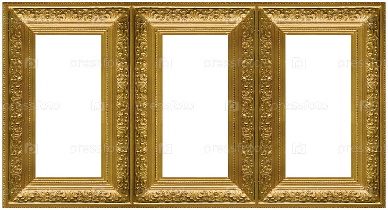 Тройная золотая рама (триптих) для картин, зеркал или фотографий, выделенных на белом фоне