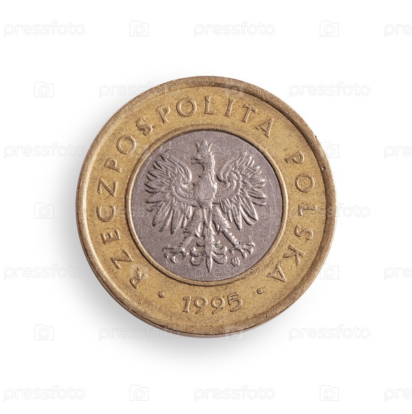 Польская монета 2 злотых. польская надпись 'Polish Lithuanian Commonwealth of Poland' на английском языке. элемент дизайна с обрезанной дорожкой
