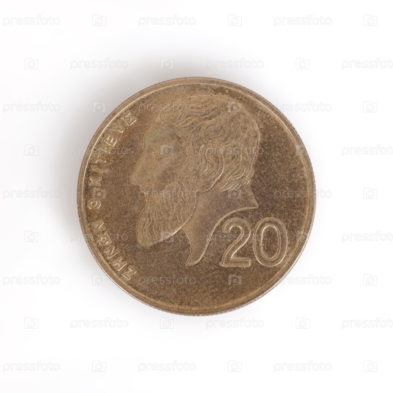 Кипрская 20-центовая монета. Греческая надпись: 20 центов. Зенон из Цития на английском языке. Элемент дизайна с обрезанной дорожкой