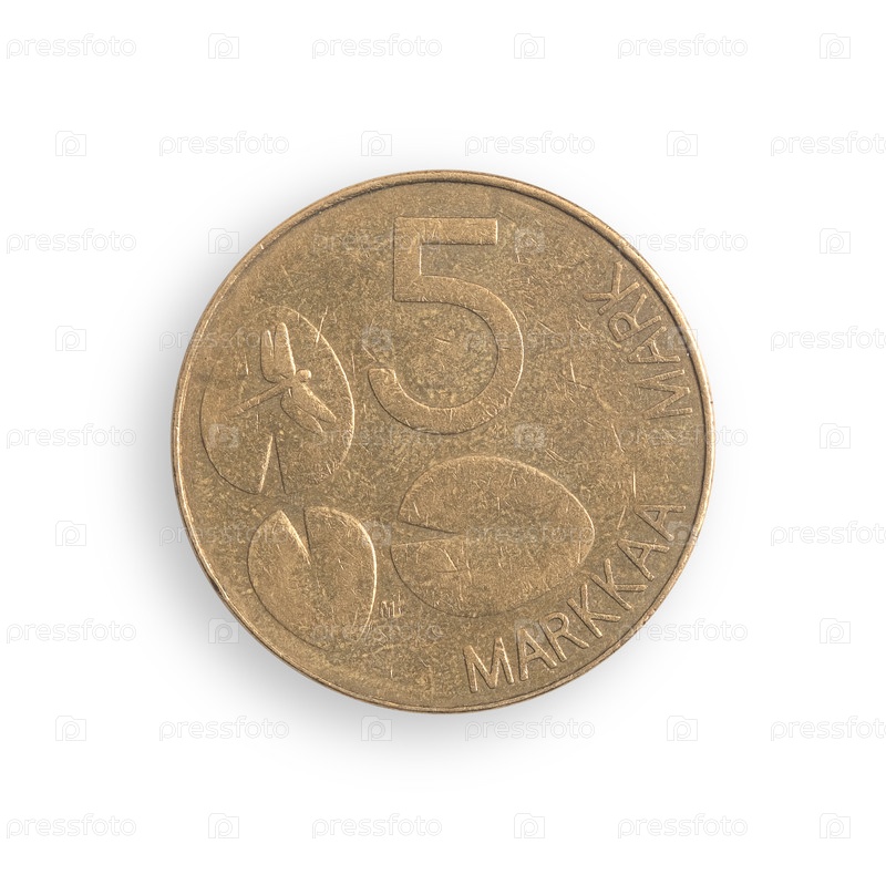 Старая финская монета в 5 финских марок выделена на белом фоне