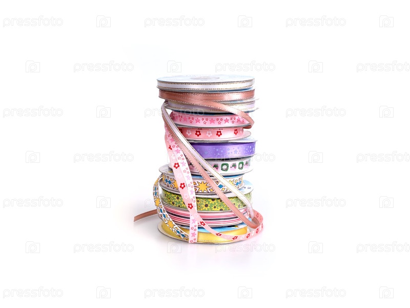 Куча катушек с лентами для украшения подарков изолирована на белом фоне