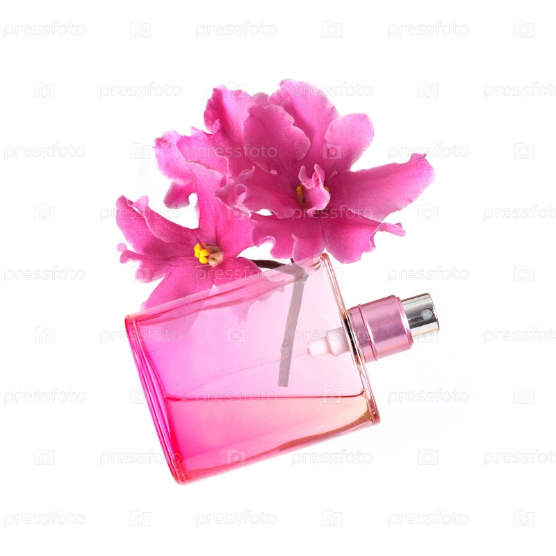 Розовый стиль бутылки с парфюмом изолирован на белом фоне