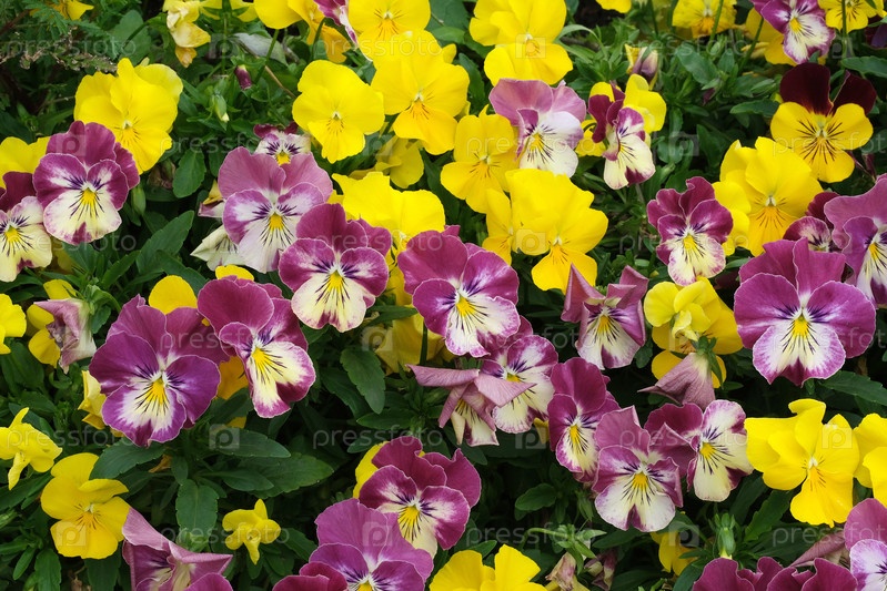 Поле цветов Viola tricolor (Wild Pansi), плотные желтые и коричневые цвета для ботанических обоев и цветочных рисунков
