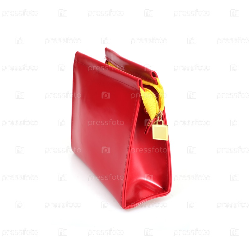 Красная косметическая сумка подчеркнута на белом фоне