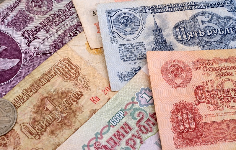 Старые советские банкноты и монеты.Изолированный фон
