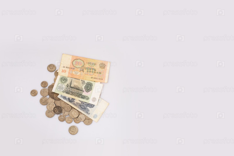 Старые советские банкноты и монеты.Изолированный фон