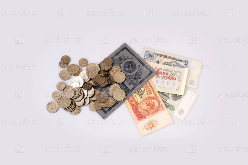 Старые советские банкноты, монеты и бумажные паспорта.Изолированный фон