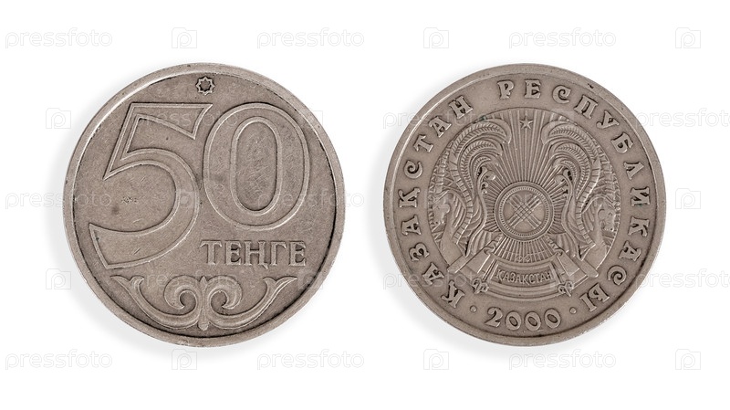 Казахская монета 50 тенге. казахская надпись означает 'Республика Казахстан' на английском языке. элемент дизайна с обрезанной дорожкой
