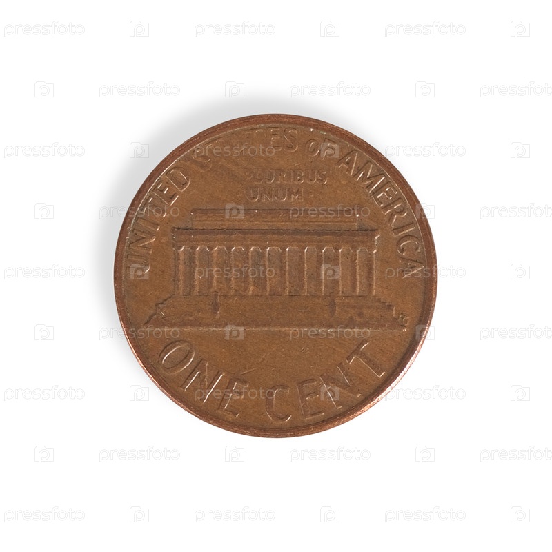 Монета в один цент США выделена на белом фоне