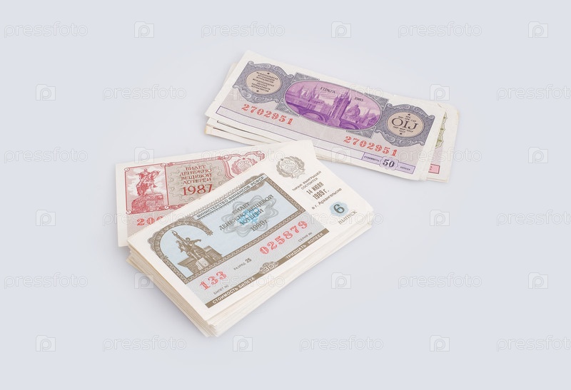 Куча старых лотерейных билетов СССР изолирована на белом фоне