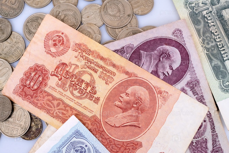 Старые советские банкноты и монеты.Изолированный фон
