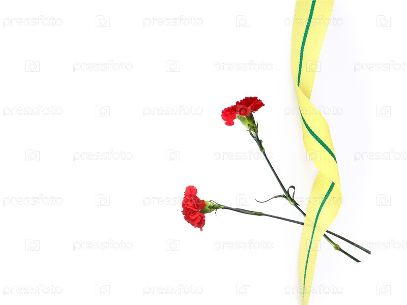 На снимке изображены красные садовые гвоздики (Dianthus caryophyllus) и желтая лента с зеленой полосой - лентой осажденного Ленинграда
