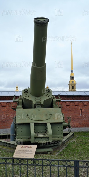 Военно-исторический музей артиллерии, инженеров и коммуникаций, Россия, Санкт-Петербург.Выставка артиллерийских орудий начала XX века, вид на крепость Петра и Павла
