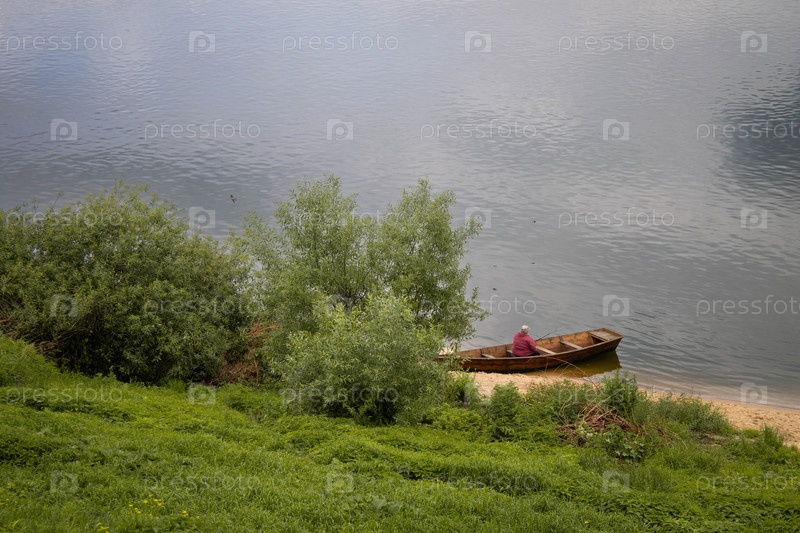 Человек в лодке рыбачит на песчаном берегу реки Ока в Тарусе с зелеными деревьями