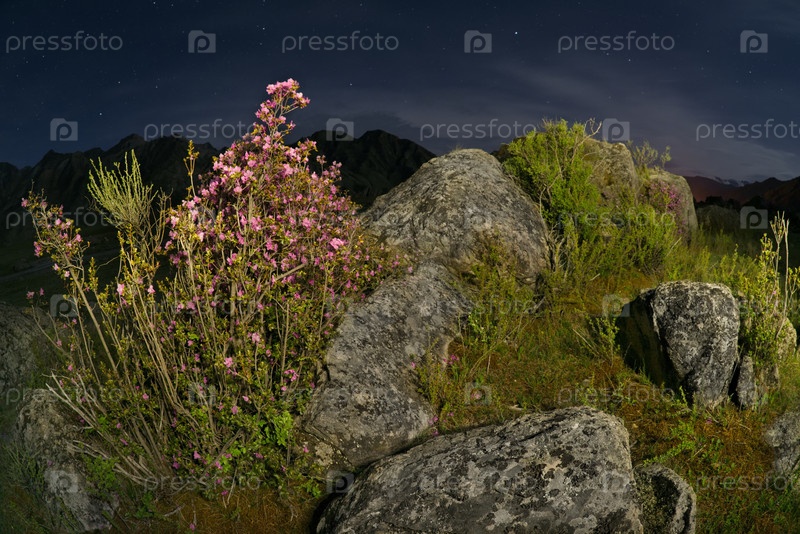 Россия. Юг Западной Сибири. Алтайские горы. Ночной вид на долину реки Катун с огромными фрагментами скал, окруженные цветущими рододендронами