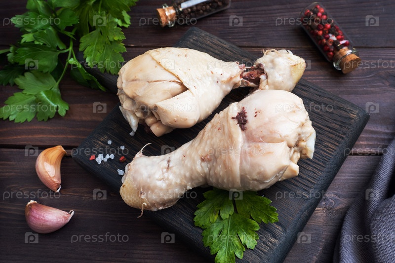 Отварные куриные палочки и специи на деревянной доске