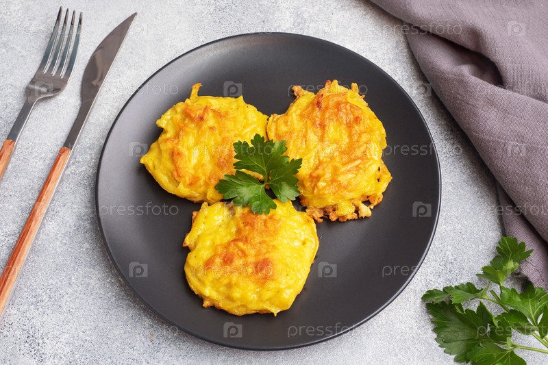 Жареные блины или драники из порезанных картофелей на тарелке