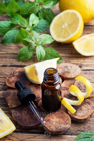 Эфирное масло лимона цитрусовых и мяты, ароматерапевтическое масло натуральной органической косметики на фоне деревенской древесины