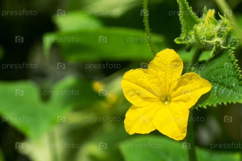 Желтые цветы цветящего огурца в теплице