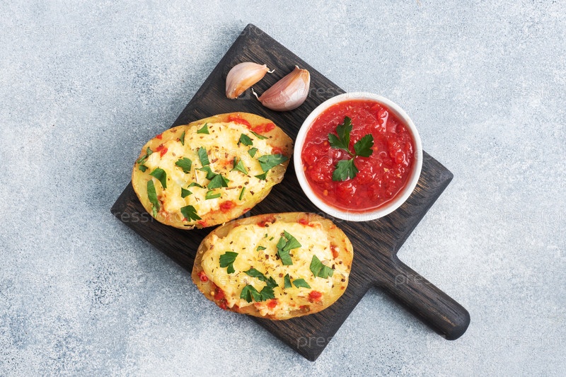 Выпеченные картофели в кожуре заполнены сыром с чесноком и травами