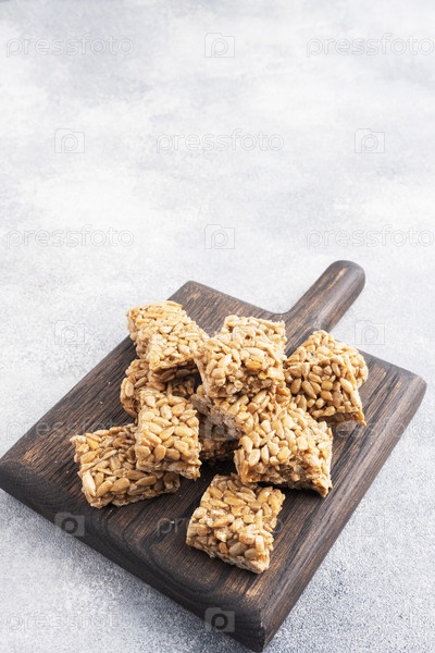 Семена подсолнечника в сахарном глазуре, восточная сладость хрупкая.Козинак разбивают на куски на деревянной доске, копируют пространство