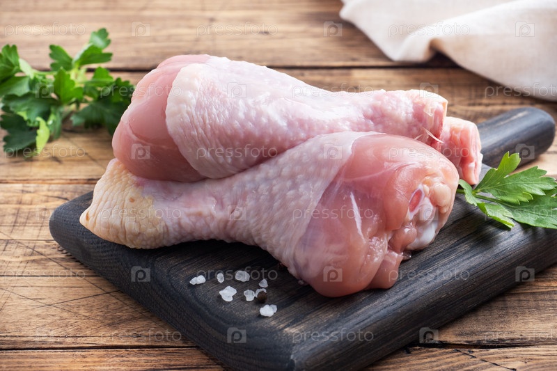 Сырые куриные палочки с петрушкой и специями на деревянной доске для резки