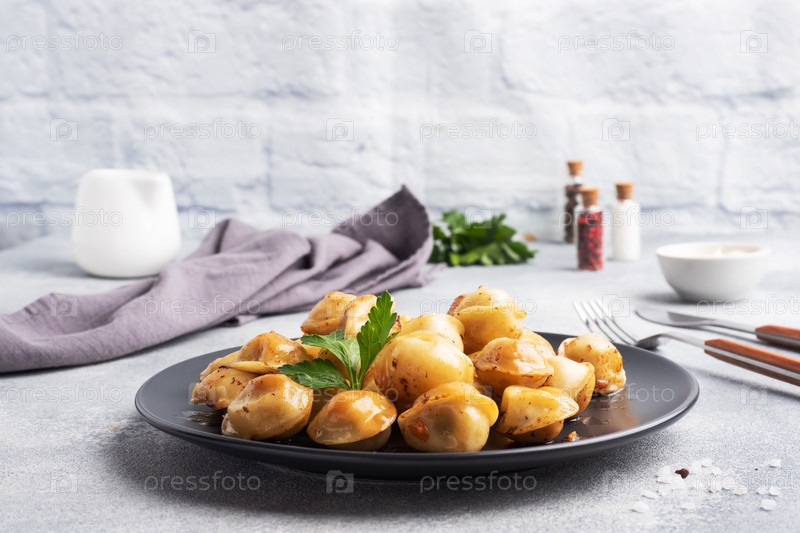 Традиционные жареные пельмени, равиоли, пюре с мясом на черной тарелке, русская кухня. серый бетонный фон, пространство для копирования