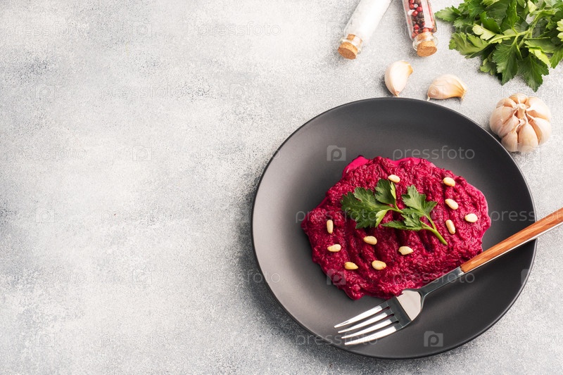 Салат из измельченной свеклы, сосновых орехов и петрушки с сливочным соусом на тарелке