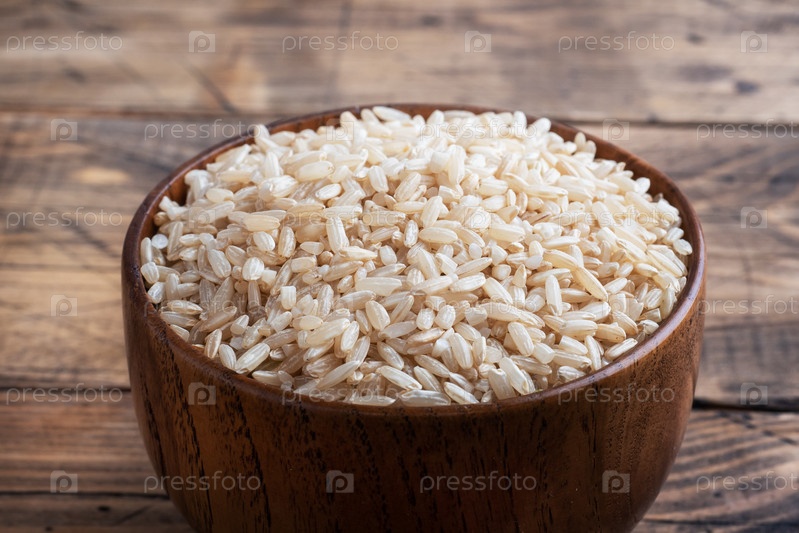 Коричневый рис - это сырое длинное зерно в миске, деревянный фон скопировал пространство