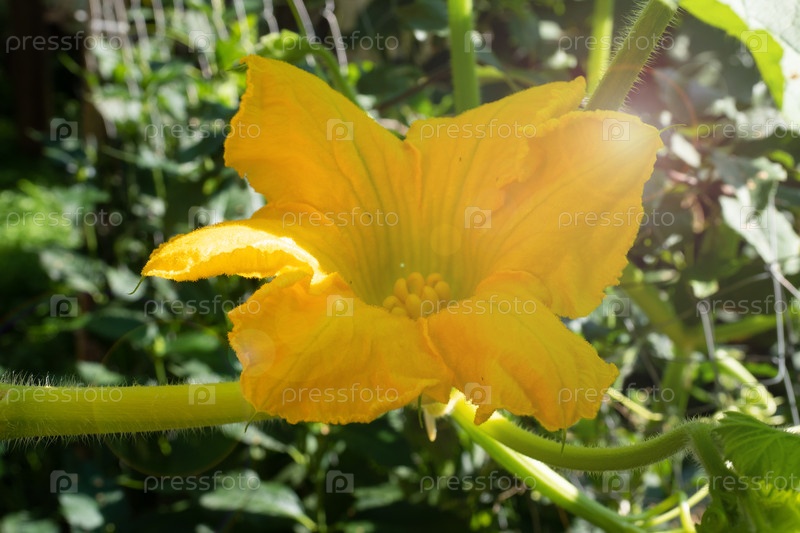 В саду растет ярко-желтый тыквенный цветок.В саду выращиваются овощные культуры, экологически чистые продукты