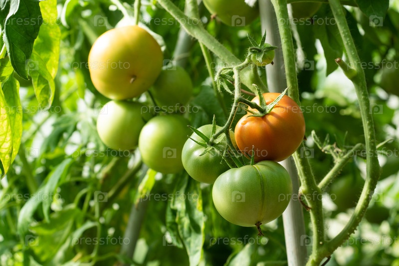 Зеленые помидоры на ветке растут в теплице