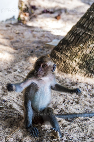 Дикие обезьяны играют на пляже Краби, Таиланд