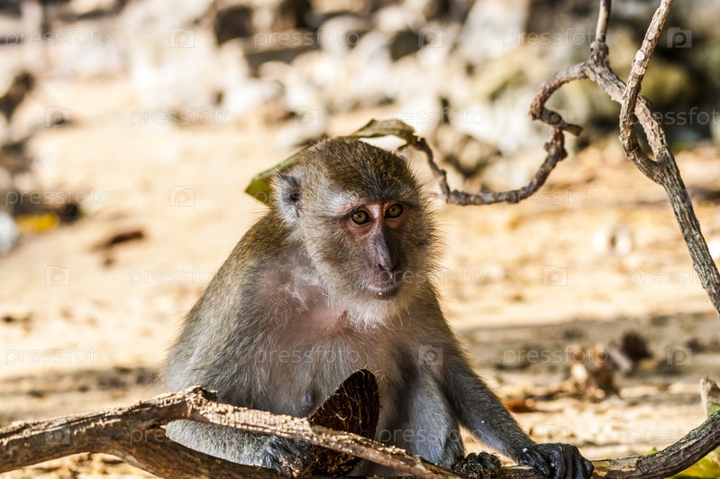 Дикие обезьяны играют на пляже Краби, Таиланд