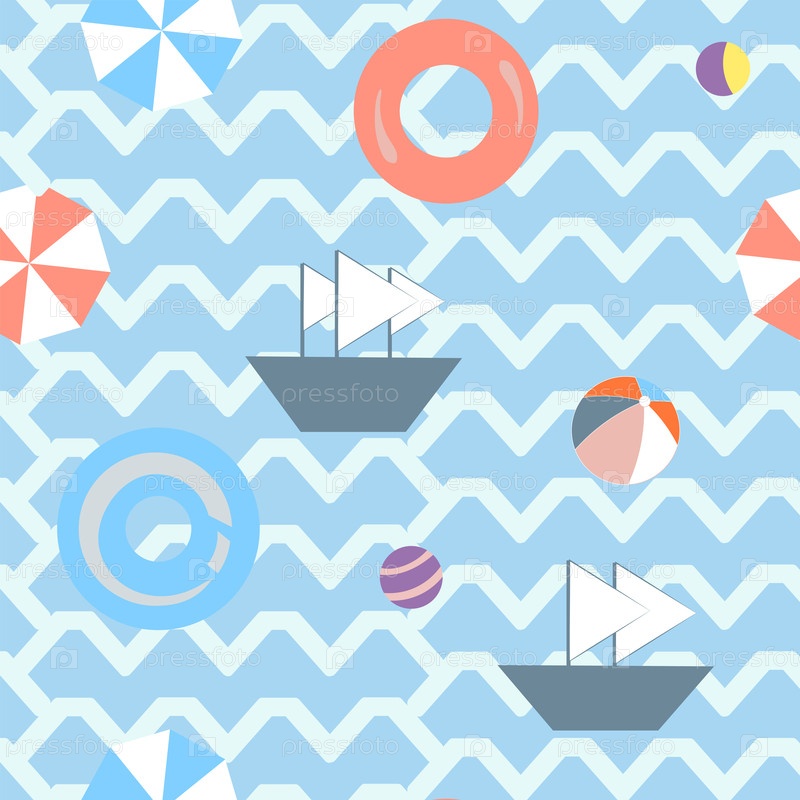 Бесшовный рисунок без фона, игра на морскую тематику, состоящая из красочных воздушных шаров, лодок и зонтиков от солнца