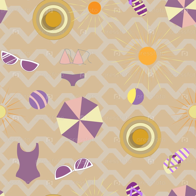 Бесшовный рисунок без фона, состоящий из красочных сандалий, шаров и зонтиков от солнца