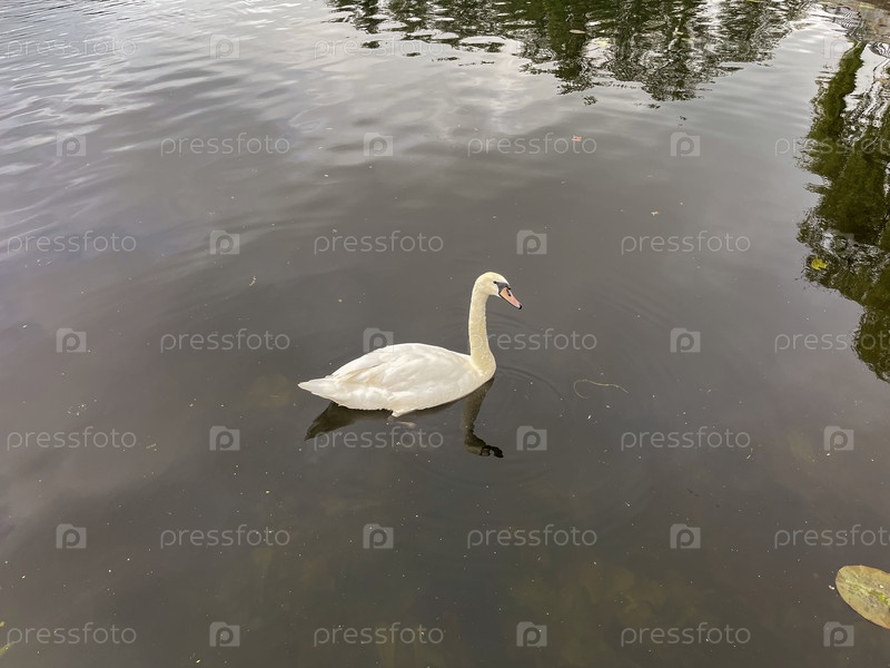 Летом белый лебедь плавает вдоль реки Муховец в Бресте