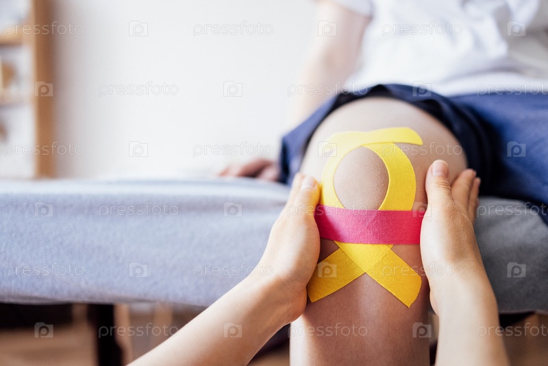Врач накладывает ярко-желтые и розовые кинезиологические ленты на женское колено