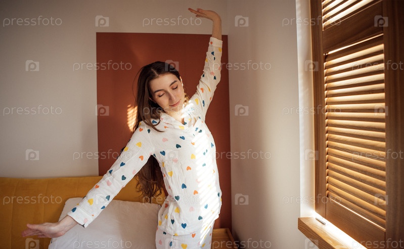 Красивая девушка просыпается и растягивается после сна. подросток носит белую пижаму с сердцами. молодая расслабленная женщина стоит в светлой комнате с деревянными жалюзи на окне