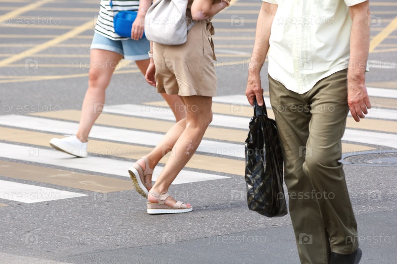 Люди пересекают дорогу на пешеходном перекрестке. ноги вблизи. снаружи в солнечный летний день