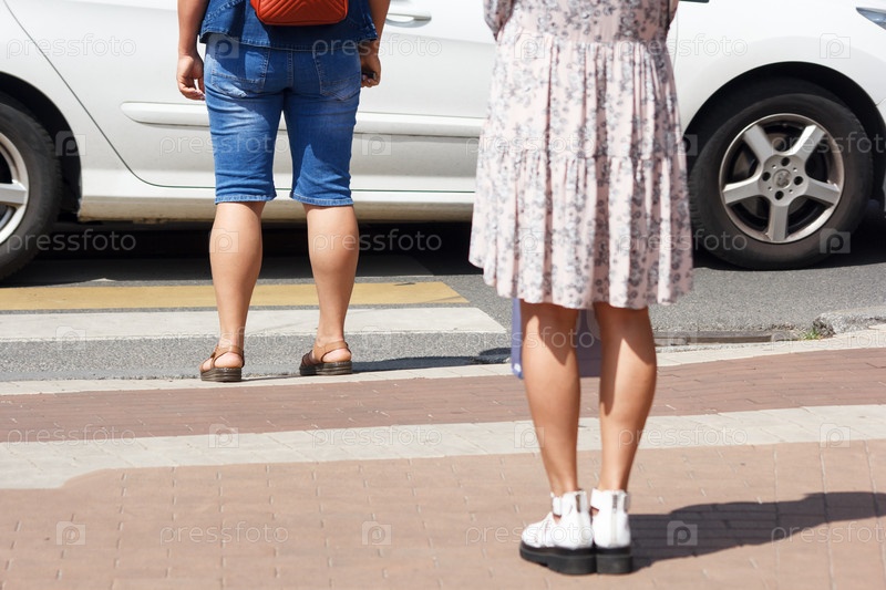 Пешеходы ждут сигнала, чтобы перейти дорогу на пешеходном перекрестке в солнечный летний день