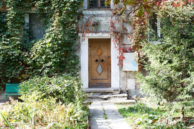 Входная дверь старого дома в городе летом