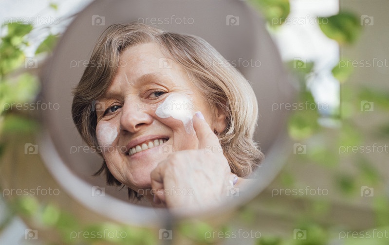 Пожилая женщина наносит косметический продукт на лицо. Отражение пенсионера с кремом в зеркале. Зрелая леди смазывает кожу увлажнителем. Уход за кожей во взрослом возрасте. Зеленые листья