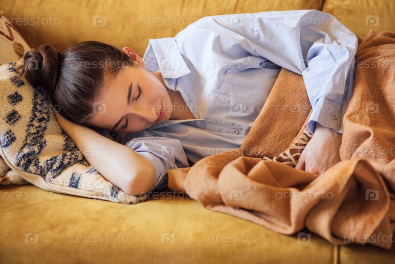 Красивая девушка в повседневной одежде спит на диване. подросток в синей рубашке лежит на желтом диване в гостиной