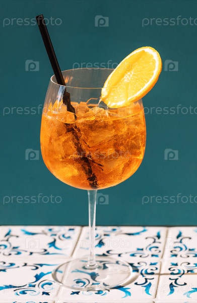 стакан аперала и кусок лимона чашка прохладного, вкусного апельсинового напитка с кубиками льда на синем фоне цитрусовый алкогольный коктейль