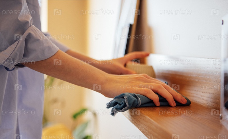 Молодая женщина в свободной рубашке стирает пыль с деревянной полки в гостиной
