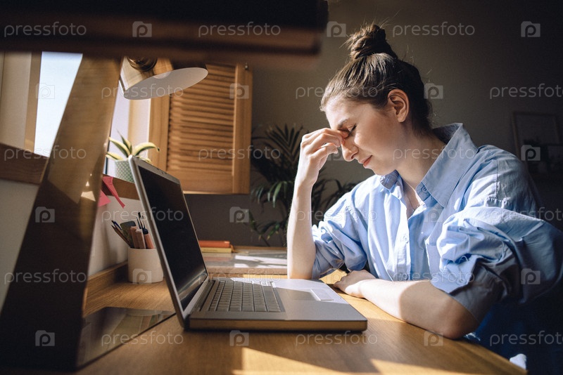 Усталая молодая женщина сидит перед ноутбуком и страдает от головной боли.Фрилансеры испытывают стресс во время работы на компьютере